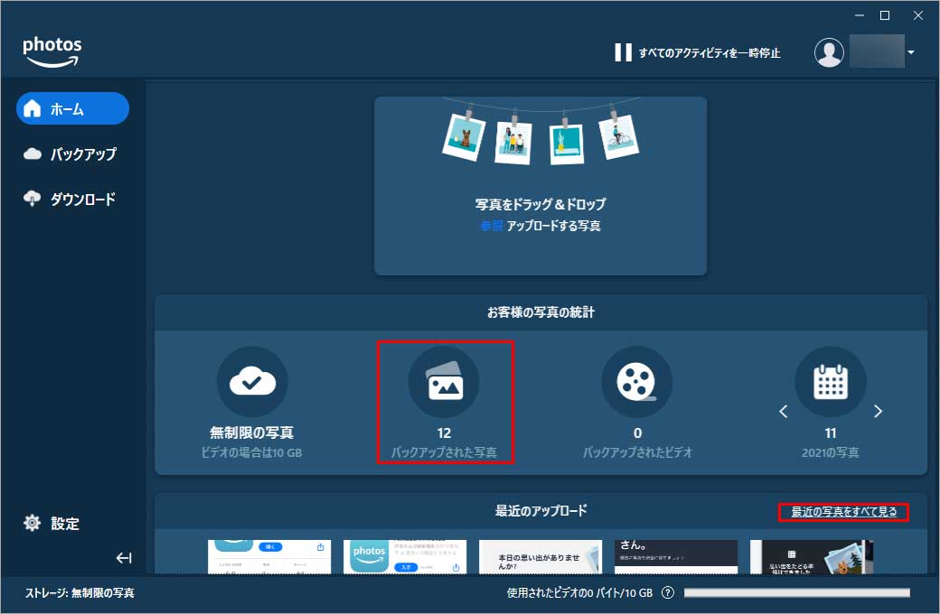 Amazon Photosを起動し、「バックアップされた写真」もしくは「最近の写真をすべてみる」を押します。