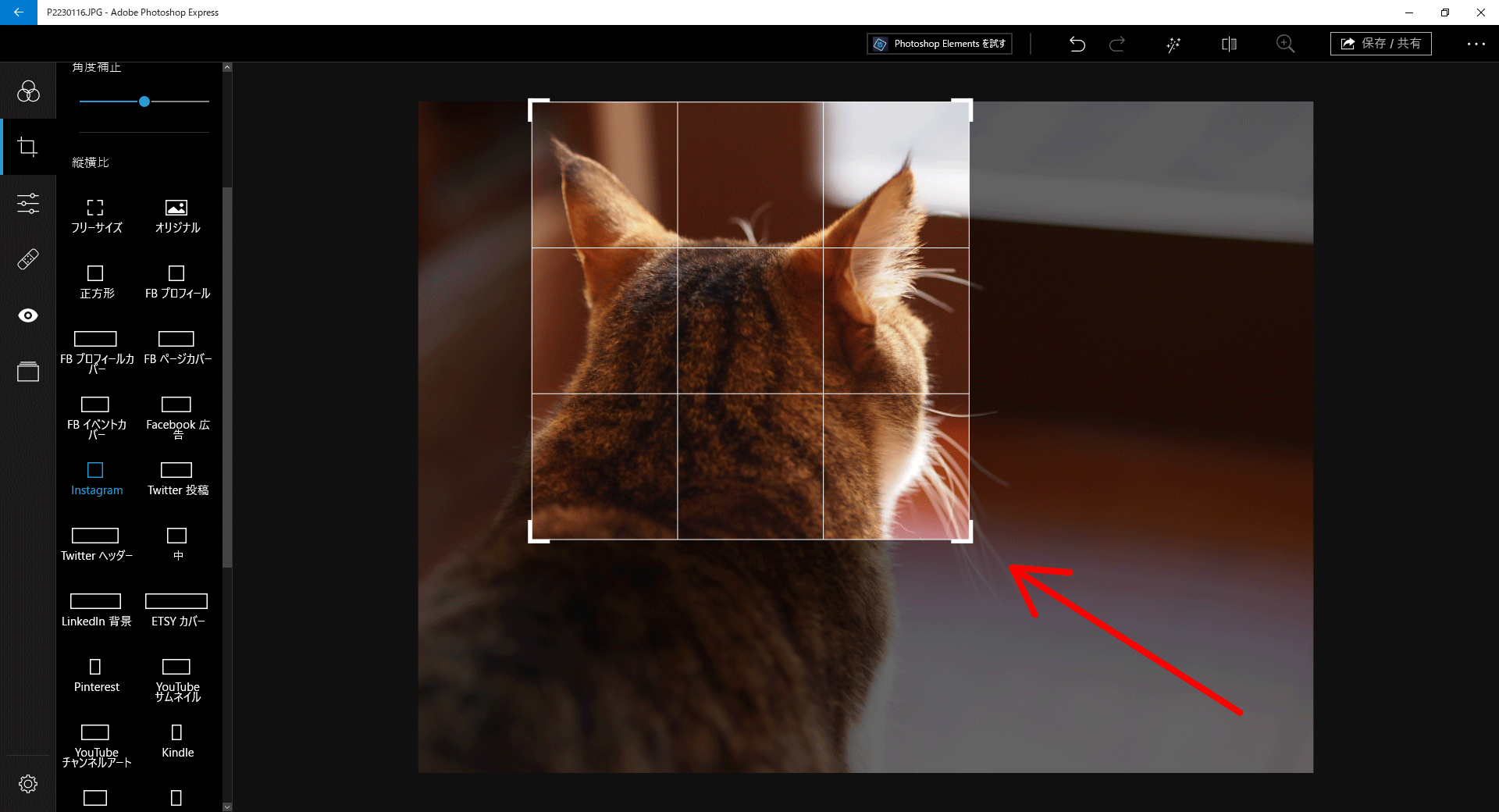 マークのところで切り抜き・回転ができます。- スクロールすると、SNSや大きさ毎に切り取りできるメニューも選択できます。