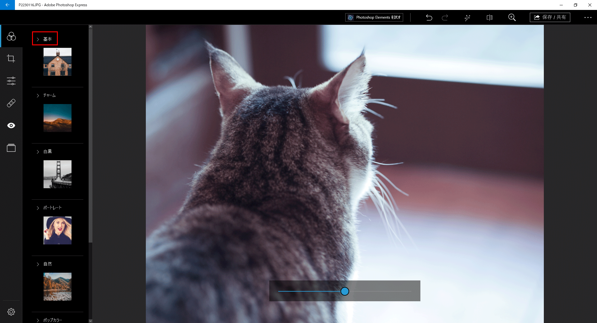 画像に表示されているバーを左右に動かすことによって、効果を適用する割合を変えられます。- 効果名を選択すると、メニューを折りたためます。