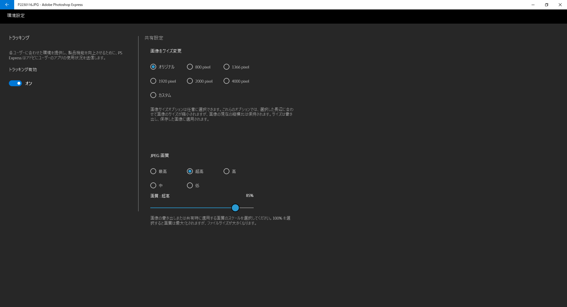 設定を行います。 まず左側のトラッキングの有無を設定します。トランキングは初期設定ではオンになっていますので、アプリの使用状況をAdobeに送信したくない場合は、オフにします。 右上の画像サイズ設定では、保存した際の画像サイズが設定できます。 右下のJPEG画質では、保存する際の画質が設定できます。